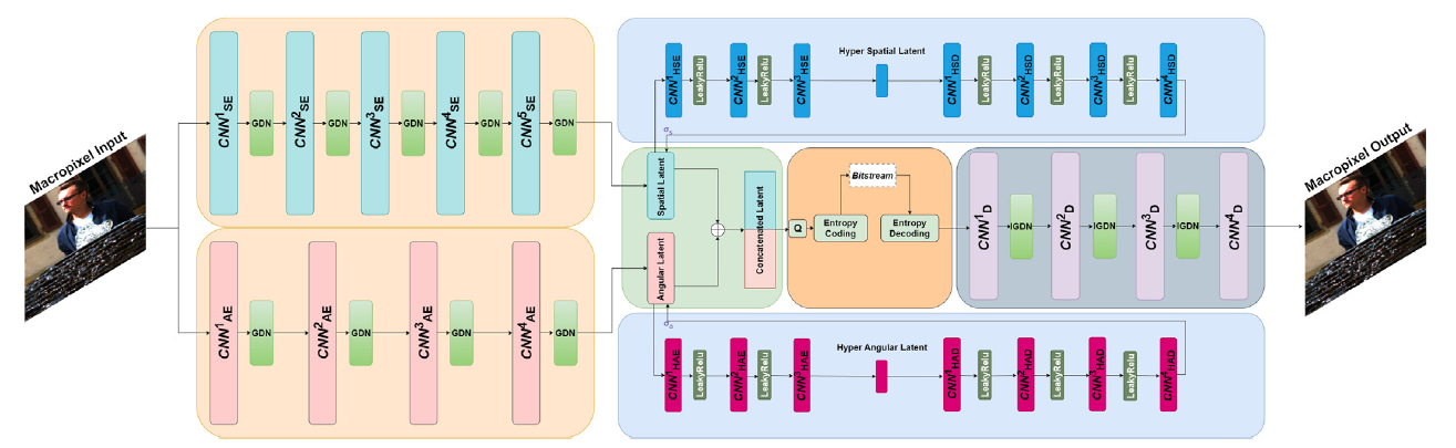 Rate-Distortion (RD) curve comparing the performance of our proposed VAE-based light field compression method against HEVC, RLVC, HLVC, JPEG-Pleno, and Shi’s method . Our method consistently outperforms the others across most datasets in terms of compression efficiency and image reconstruction quality, except for Shi’s method, which shows superior results on a few specific datasets.